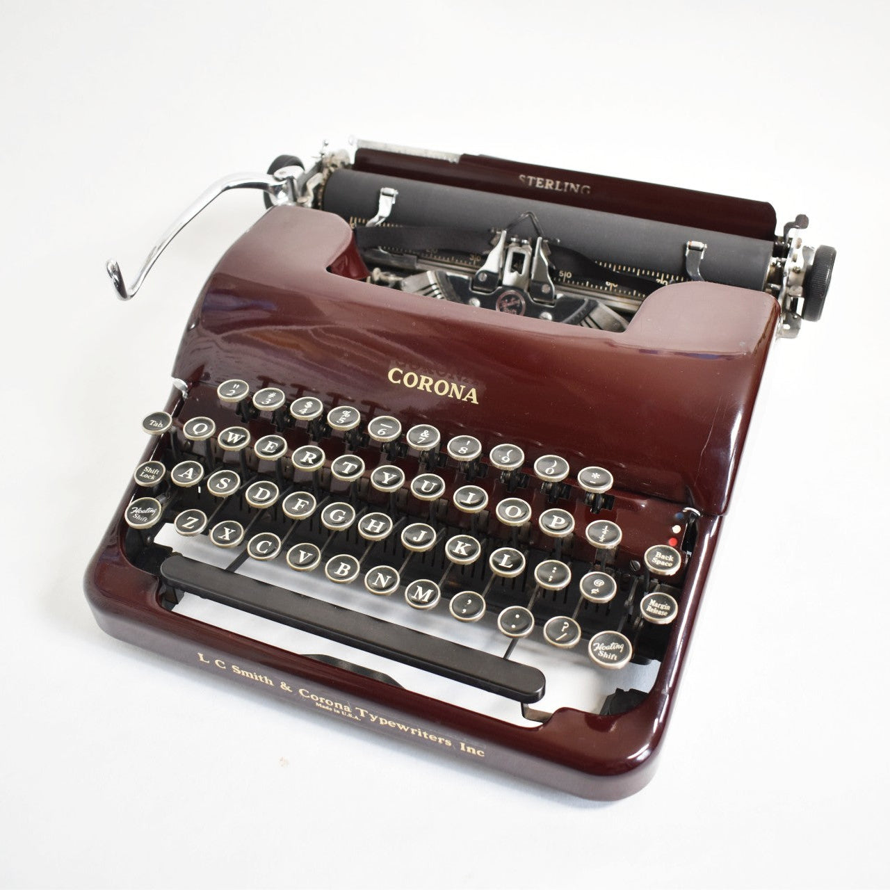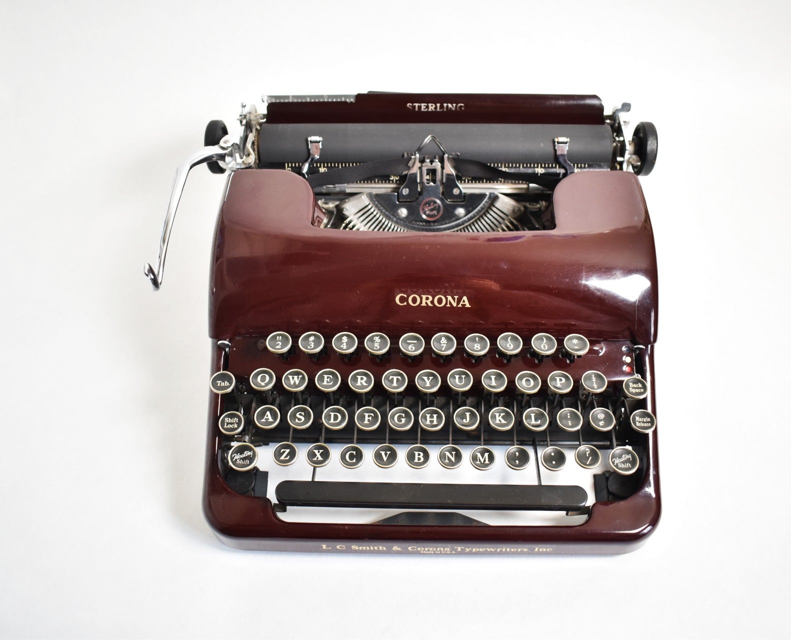 Smith Corona is one of the most sought after typewriter brands, produced many popular portable models for writers throughout the years. This early 1939 Standard Smith Corona is a model of the 2A series. It has a great maroon finish (less common than it's black counterpart). It is a great typewriter choice for writers because it is heavy-duty and can keep up with regular use! This Corona typewriter boasts with a supple and light key feeling, fast responsive keys, and a light segment shift.