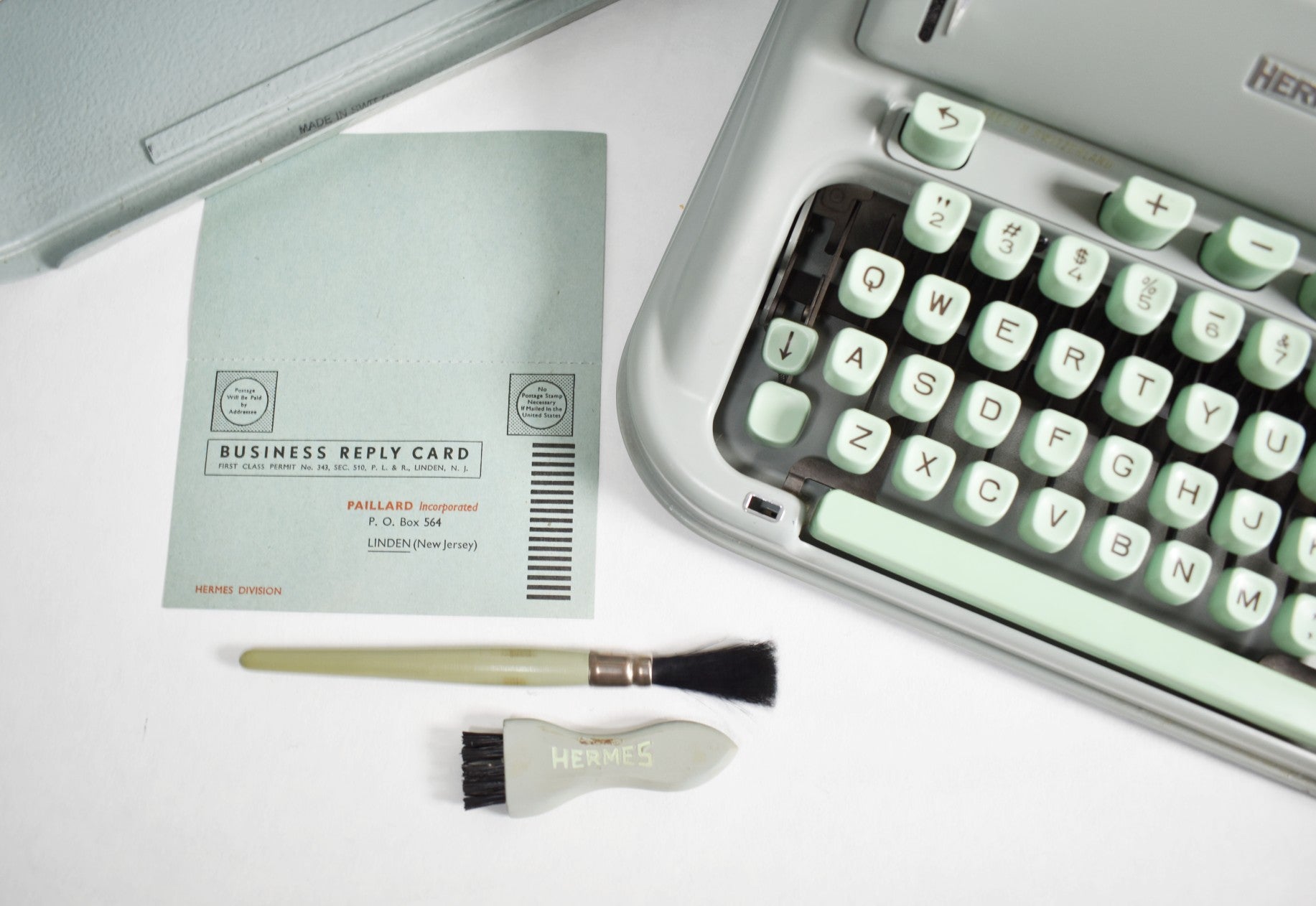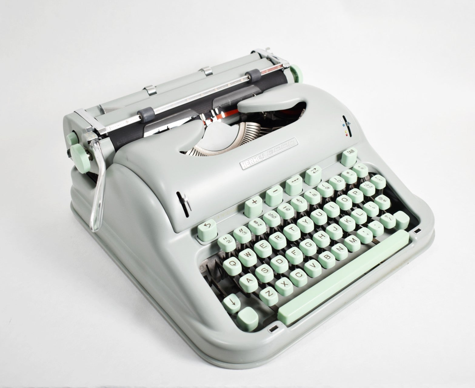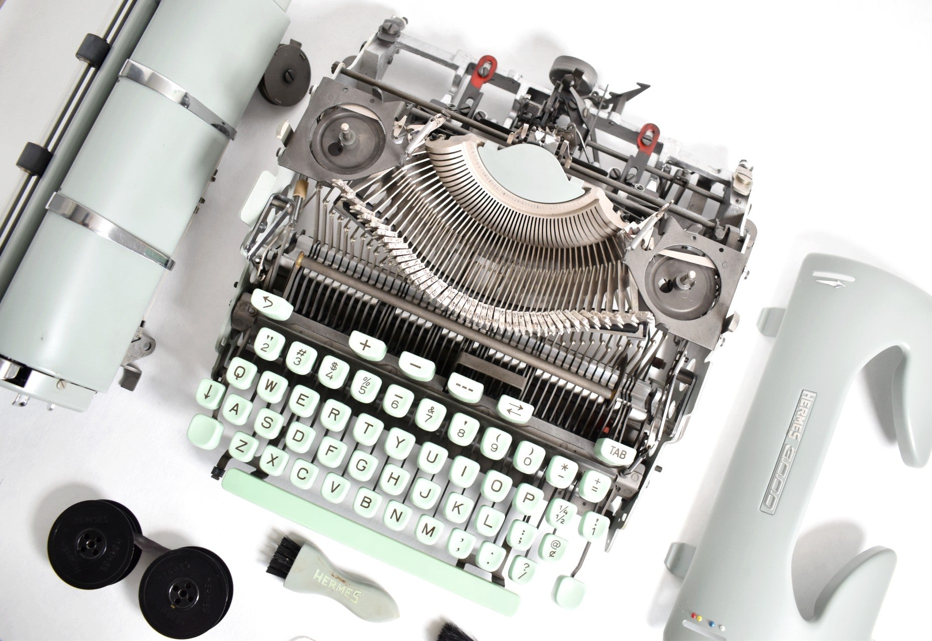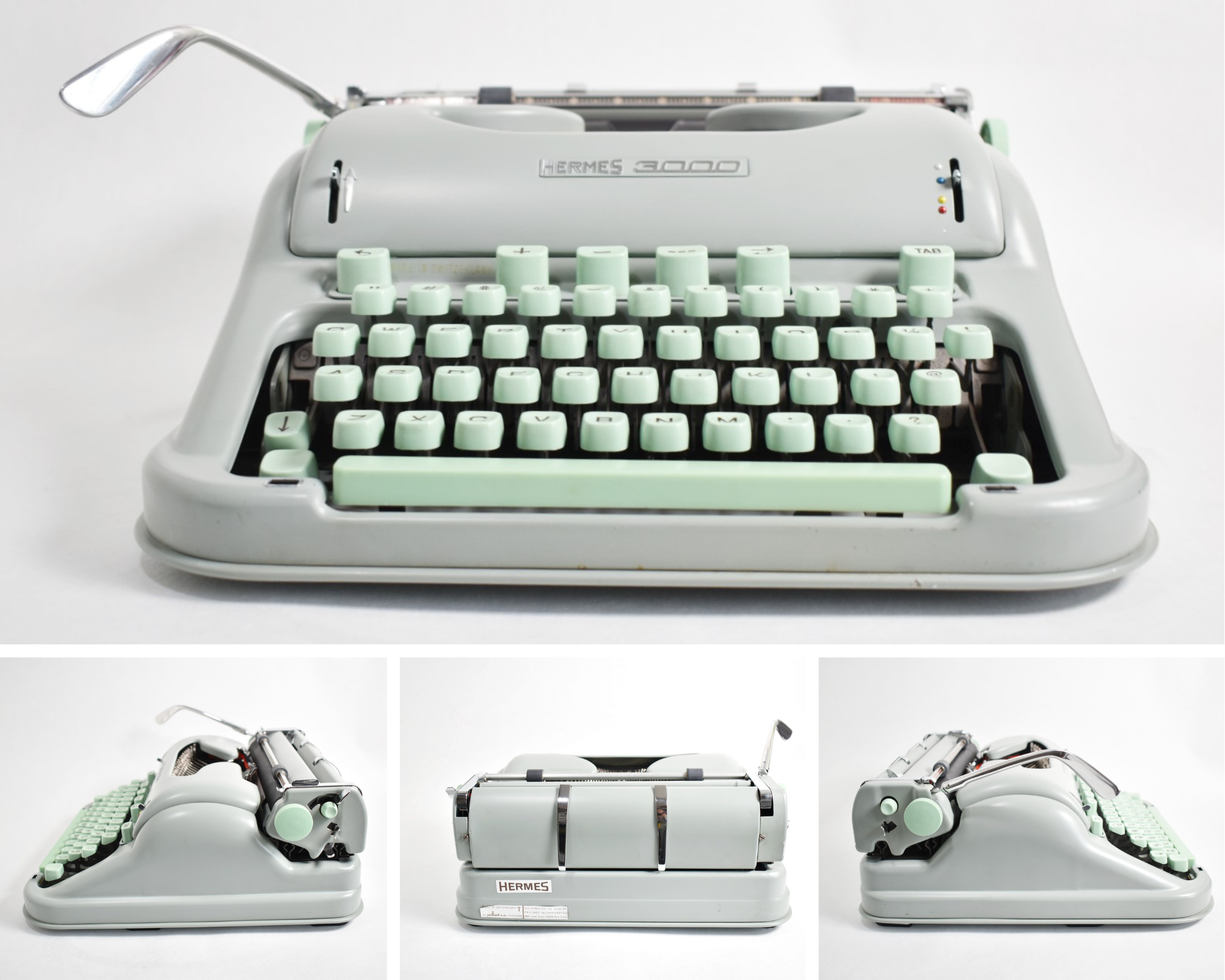 A true icon - the Hermes 3000 typewriter with mint green keys and body. Hermes typewriters were developed in Switzerland by the Paillard S.A. company, which started out making music boxes in the early 19th century and later transitioned to typewriters in early 1920s. Hermes 3000 is possibly the most famous and cool typewriter ever.